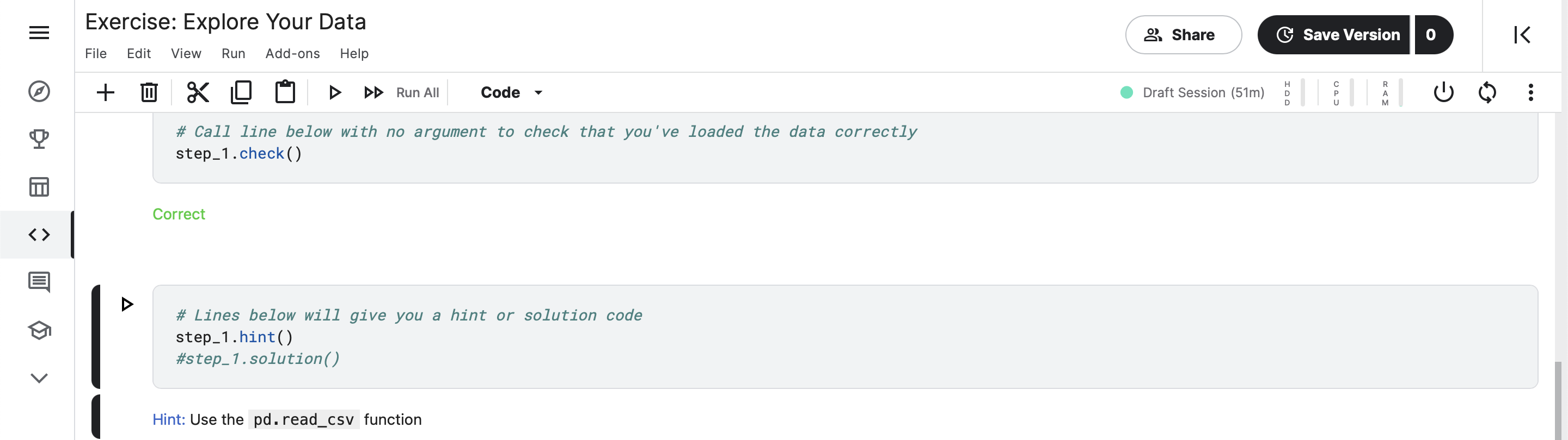 지금까지는 기능 소개였고... 이 Exercise라는게 진짜 마인드블로잉한데,,, 캐글에서 배우기 쉬우라고 스텝별로 맞았는지 틀렸는지, 또 모르면 힌트도 쓸 수 있게 메소드를 준비해놨습니다. 미쳤죠..;